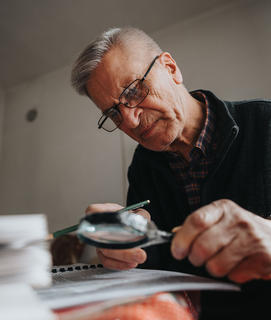Mann mit Lupe liest ein Dokument auf dem Tisch